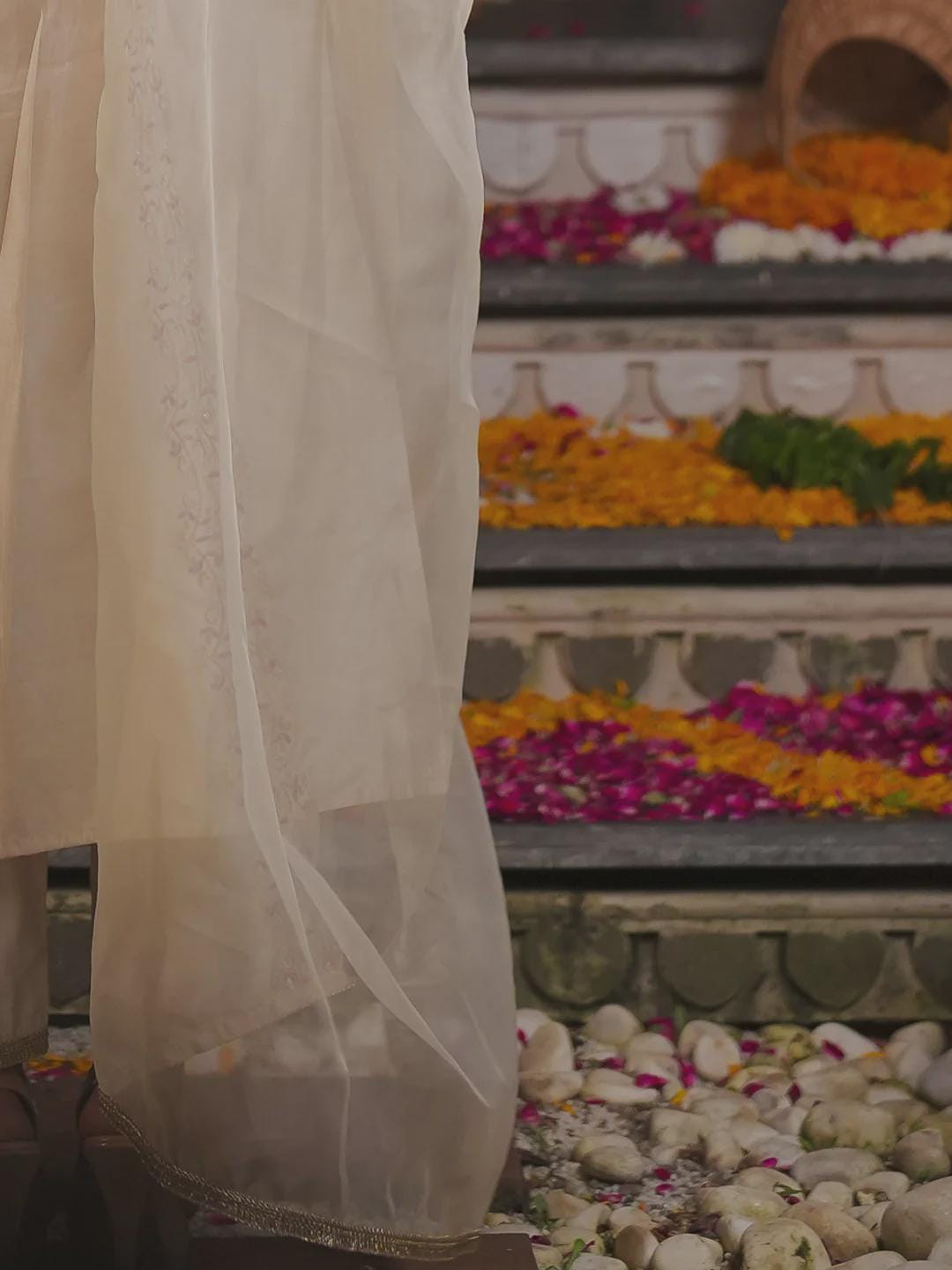 Make an elegant impression in this timeless off-white straight kurta set, crafted in soft and flowy Liva fabric for a graceful drape. The kurta features intricate floral embroidery across the front and sleeves.Kurta is paired with partially elasticated cotton blend trousers, embroided at hem line and a delicately embroidered organza dupatta.