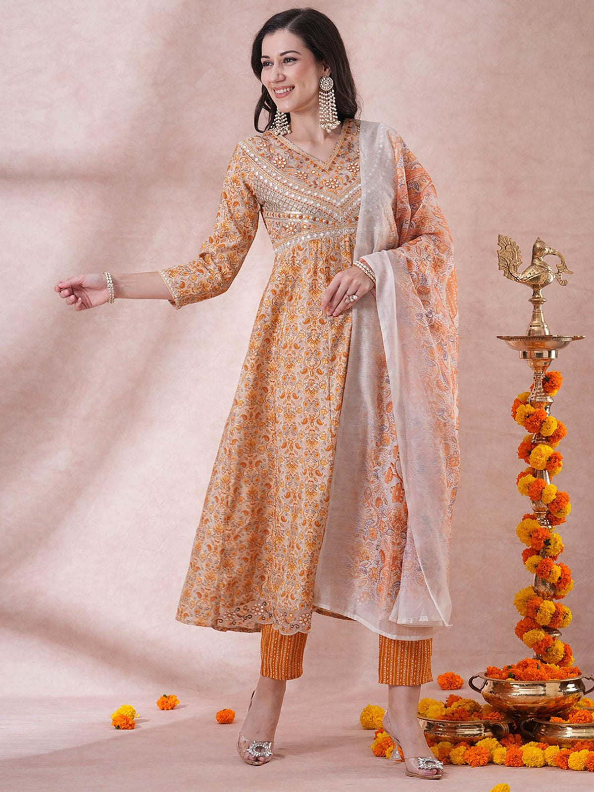 This exquisite Muslin Silk Dress Set is a perfect blend of traditional craftsmanship and modern elegance, designed with soft muslin silk fabric featuring an all-over print enhanced by delicate gold foil detailing, creating a subtle yet luxurious shimmer. The straight-cut silhouette offers a flattering fit, making it both comfortable and stylish . A standout feature of this ensemble is the yoke area, crafted with a sheer organza overlay on top of the printed fabric, adorned with intricate thread and zari embroidery, adding a rich, regal touch to the outfit. The delicate embroidery enhances the neckline and upper bodice, making it a truly eye-catching design, while the three-quarter sleeves maintain an elegant balance, offering a sophisticated and graceful look. Paired with matching straight-cut muslin silk pants, this set exudes understated elegance while ensuring ease of movement. Completing the look is a lightweight, printed muslin silk dupatta, designed to drape effortlessly and add an ethereal charm to the ensemble.